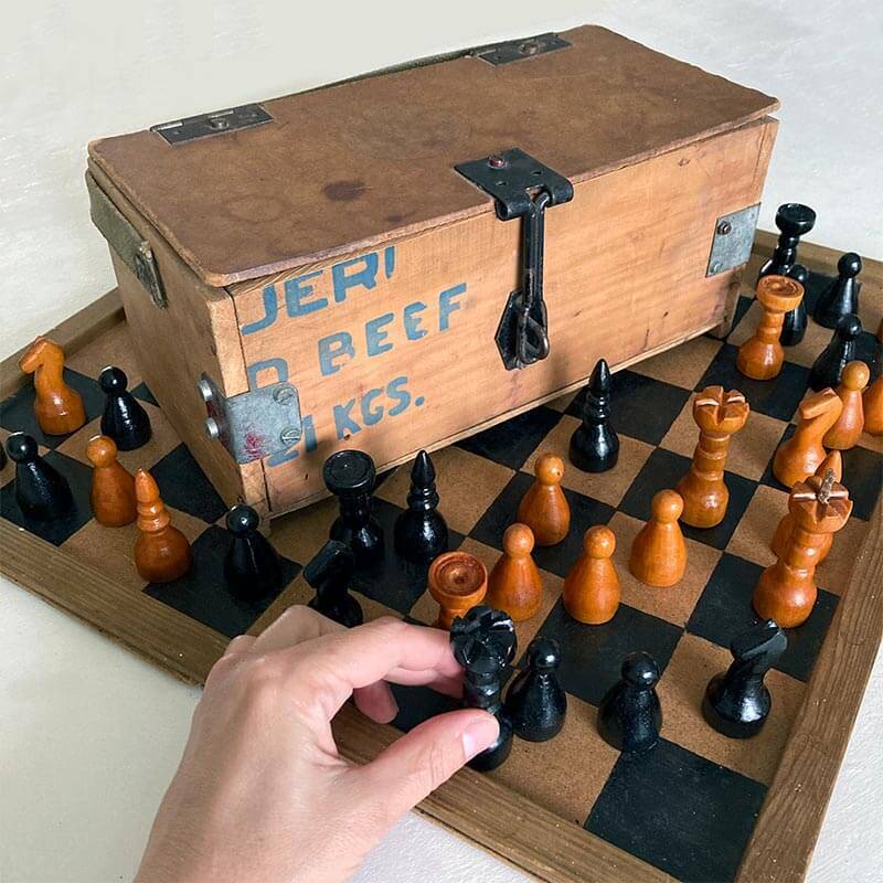 Rond 1953 lid van Schaakvereniging Reuver en maker van dit prachtige, handgemaakte schaakspel en houten kistje. Hij was een broer van mijn oma Gertrud. Nooit getrouwd en werkte als tuinder op plekken waar seizoensarbeid nodig was. Reisde regelmatig naar Frankrijk, en werkte in 1953 op de wijngaarden van de familie Duhr bij Niederdonven en Wormeldange in Luxemburg. Tot op hoge leeftijd woonde hij nog 'op kamers' in Geleen, waar hij halve sigaretjes zonder filter rookte en stapels kranten las. Als kind bezocht ik hem een paar keer samen met mijn oma, bijzondere herinneringen aan een man die zich ook goed alleen kon amuseren.
