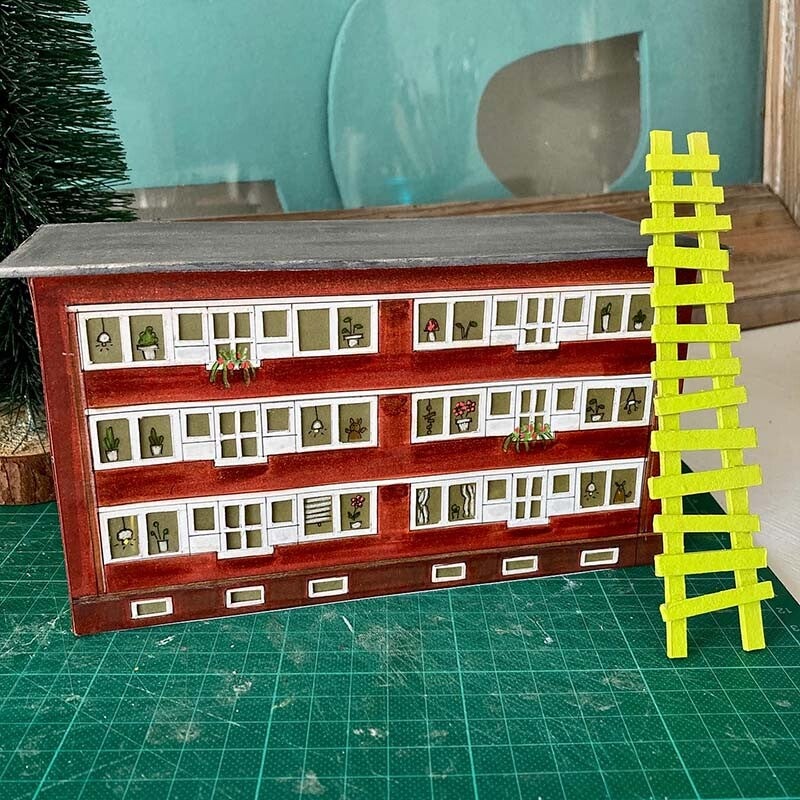 Toen het trappenhuis in onze oude Krempelflat na avondval niet meer gezellig verlicht werd door de kleine kerstboom heb ik een mini-krempelflat gemaakt die dankzij een timerfunctie in de avonduren zijn lampjes aan doet.
