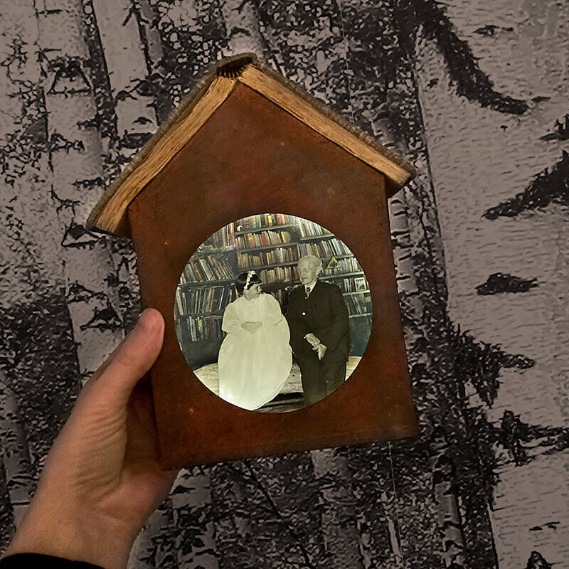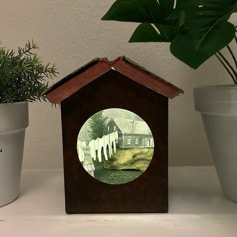 Kleine decors waarin 'familieleden van toen' elkaar opnieuw ontmoeten. Oude bijbelboekjes dienen als dak en dankzij de lampjes met timer-functie komt het verleden in de avonduren weer tot leven.